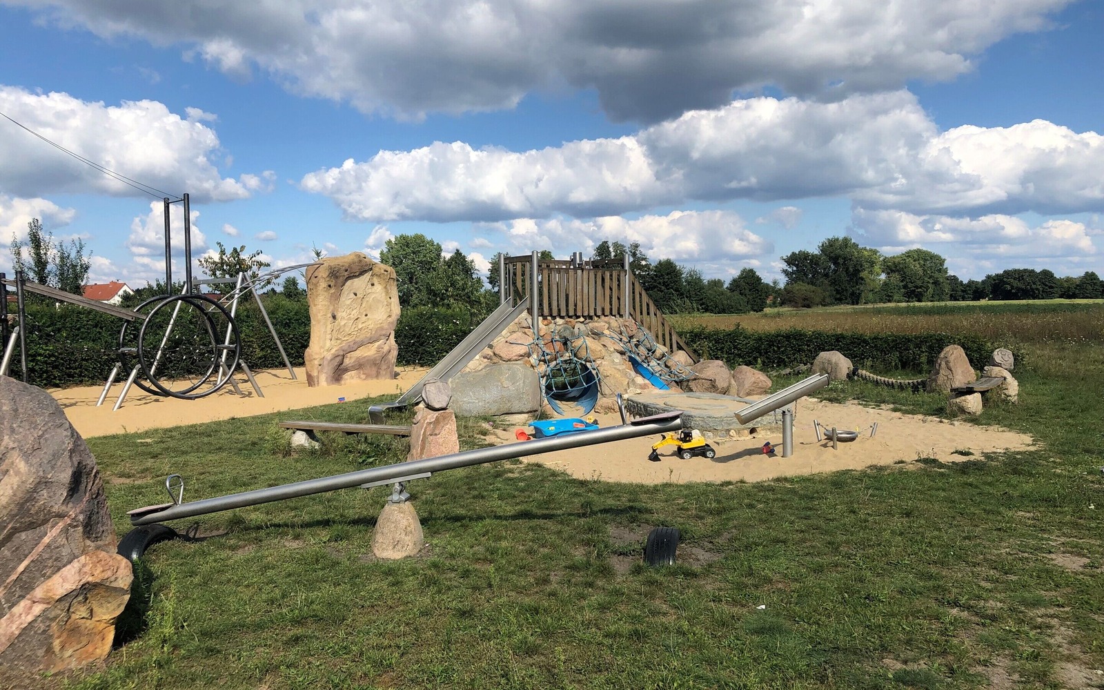 Der Spielplatz bietet vielfältige Bewegungs- und Erlebnisangebote. Klettergerüste mit Seilen, Rutschen und Balanciermöglichkeiten laden zum Ausprobieren ein. Ergänzt wird das Areal durch einen Sandspielbereich mit Wippen, eine kleine Rodelanlage sowie natürliche Spielelemente aus Holz und Stein.