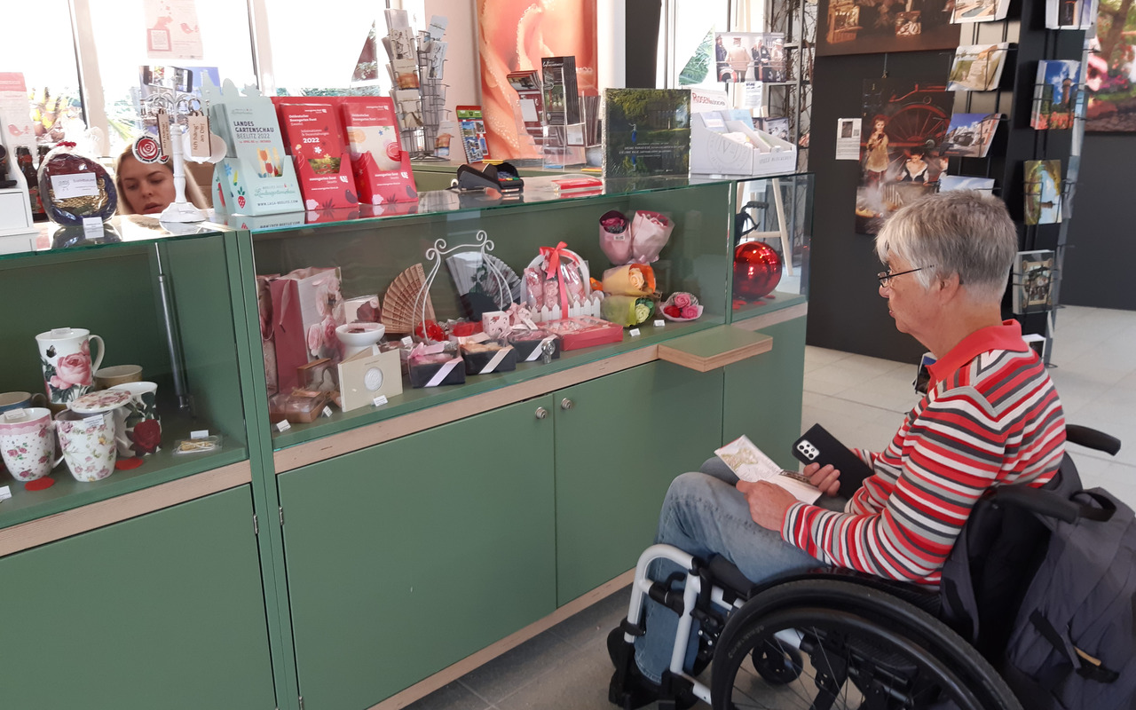 Auch als Rollstuhlfahrerin macht es mir Spaß, zwei Attraktionen dieser kleinen Stadt zu erkunden. Zunächst geht es in den rund 17 Hektar großen Rosengarten. Die historische Parkanlage aus dem Jahr 1913 steht unter Denkmalschutz. Zu bewundern sind zehntausende Rosen, darunter botanische Besonderheiten. Kein Wunder, dass der Stadt 2004 der Titel „Rosenstadt“ verliehen wurde. Das ebenerdige Besucher- und Ausstellungszentrum verfügt über einen automatischen Türöffner. Ebenso die Wege im Park sind gut berollbar. Unterwegs laden  Wasserspiele, Bänke, ein barrierefreies Restaurant und ein ebensolches Café zum Verweilen ein, und mehrere barrierefreie Toiletten sind  leicht auffindbar. Allerdings sind einige Infotafeln teils zu hoch angebracht. Es ist ratsam, sich vorab über die barrierefreie Wegeführung im Park zu informieren, vor allem darüber, wie man stufenlos in den tiefer gelegenen Jubiläumsgarten gelangt.