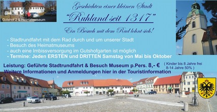 Einer Radtour in und um Ruhland die "Geschichten einer kleinen Stadt". Nach einer kurzen Einführung über den Ablauf dieser Tour und bei einem Erfrischungsgetränk bringt Ihnen der Heimatverein unsere kleine Stadt näher. Auch das Heimatmuseum ist geöffnet.