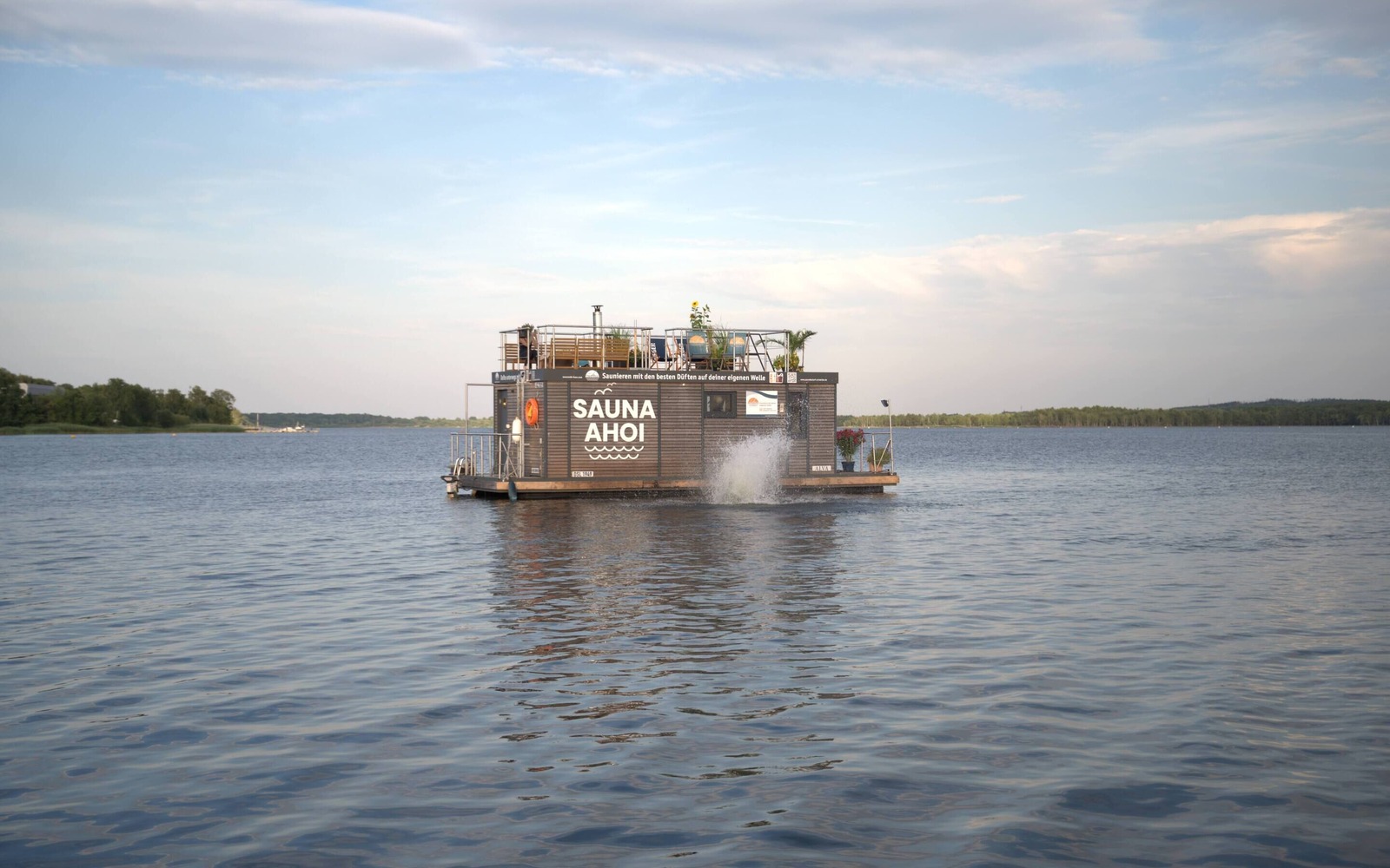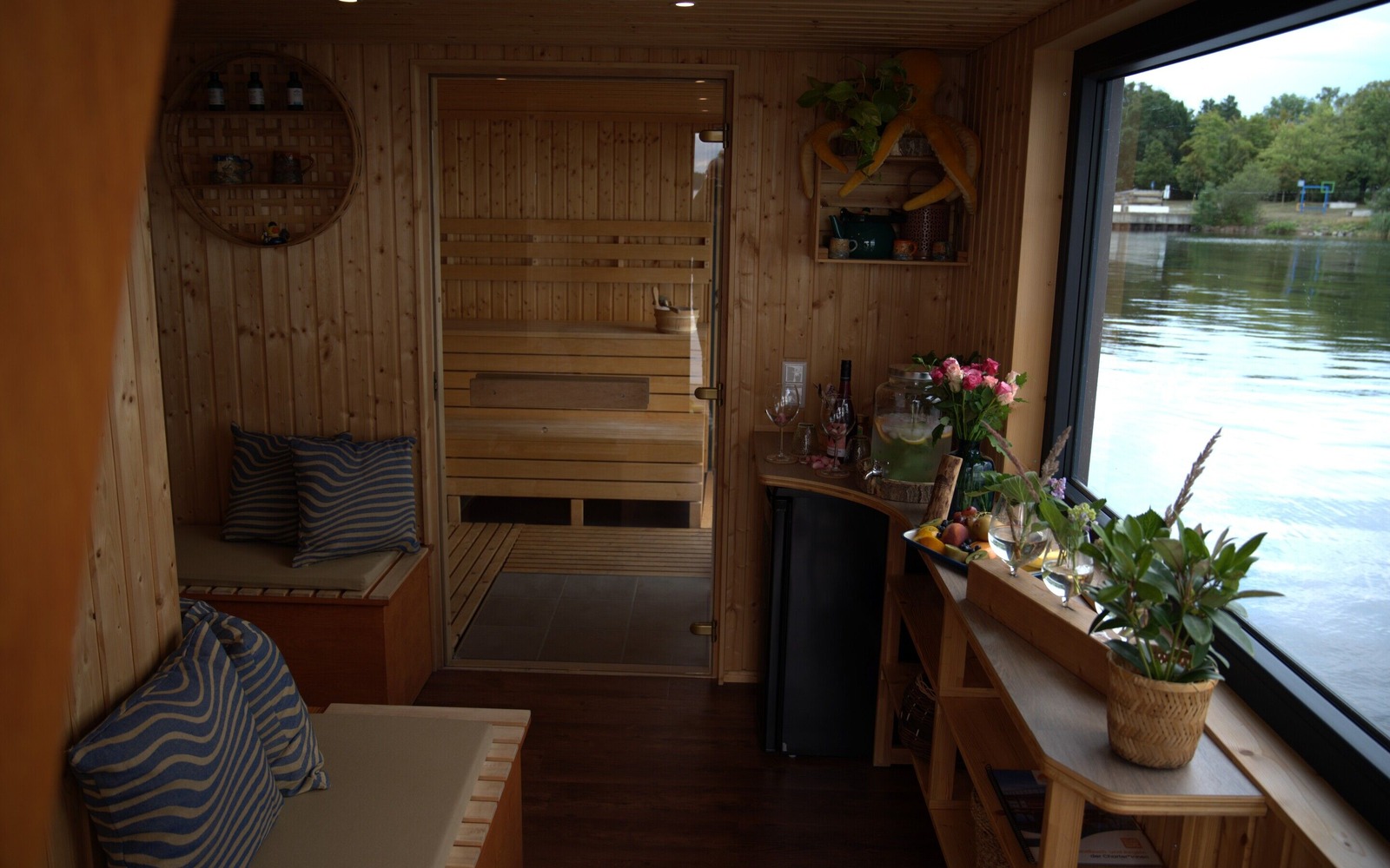 Die finnische Sauna an Bord erreicht Temperaturen von etwa 90° bis 120° Celsius. Während des Saunagangs eröffnet das Panoramafenster einen atemberaubenden Ausblick auf den Senftenberger See und die umgebende Natur. Die Saunaflöße sind zudem mit einer Lounge, Sitzmöglichkeiten, einem Kühlschrank sowie einem separaten WC mit Dusche ausgestattet. Auf den großzügigen Dachterrassen stehen Liegestühle bereit, um die Seele baumeln zu lassen.