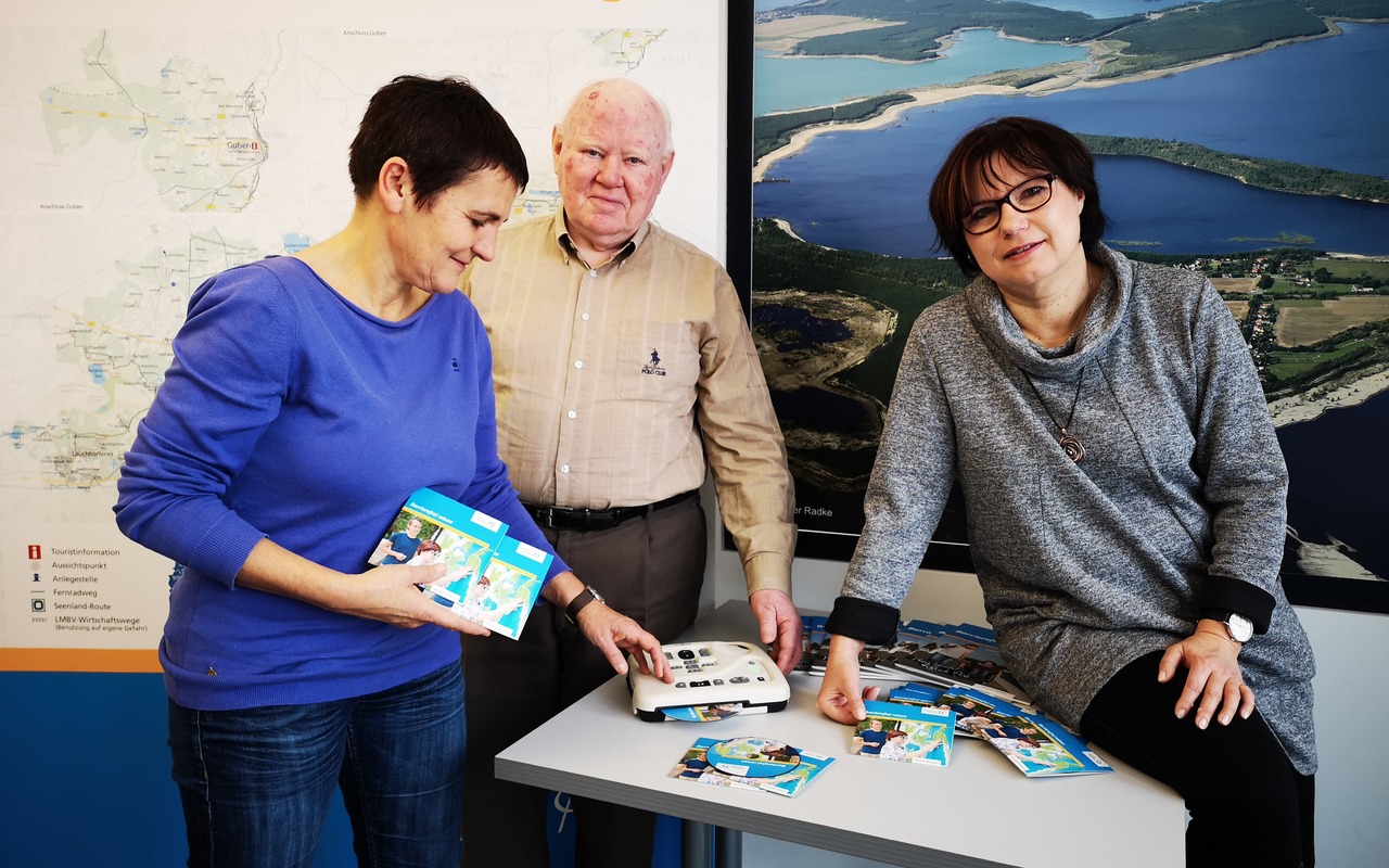 Der Tourismusverband Lausitzer Seenland e.V. freut sich mit seinen Unterstützern über das neue Serviceangebot für blinde und sehbehinderte Menschen: Kathrin Winkler, Geschäftsführerin des Tourismusverbandes Lausitzer Seenland e.V., Manfred Müller, Vorsitzender Blinden- und Sehbehinderten Verband Brandenburg e.V. Bezirksgruppe Senftenberg und Manuela Krengel, Koordinatorin bei REKOSI - Regionale Kontaktstelle für Selbsthilfe und Interessengruppen mit den neuen DAISY-CDs (v.l.n.r.)