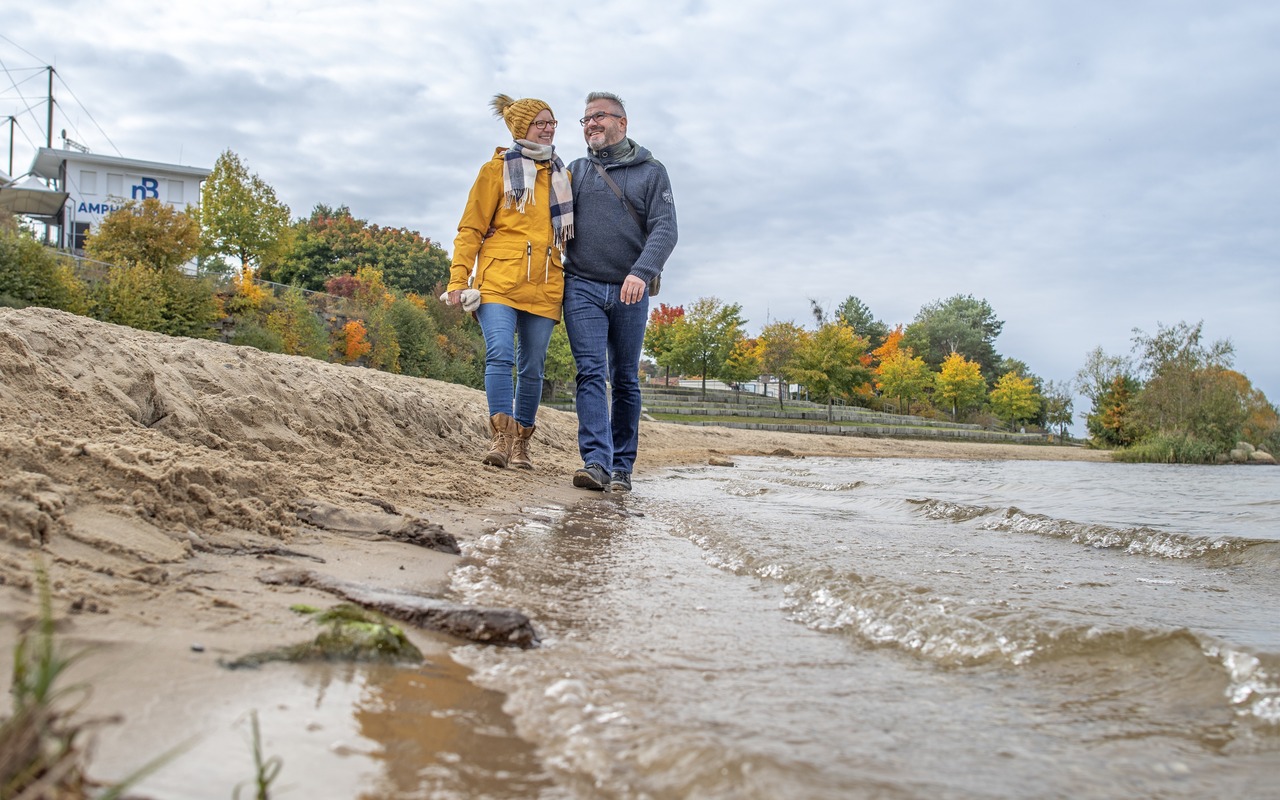 Paar spaziert am Strand am Senftenberger See, Foto: Nada Quenzel