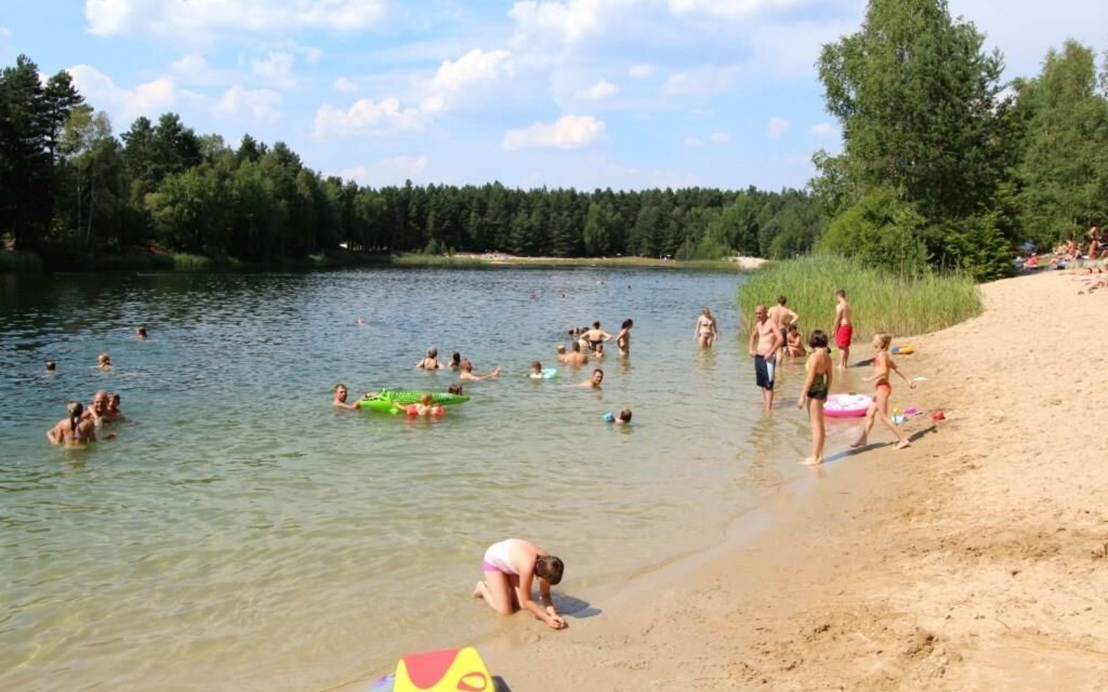 Groß Düben forest lake has a number of smaller bathing areas and a large main bathing area. The lake is 13 to 15 metres deep, with a length of 380 metres and a width of 160 metres. Located in the middle of the forest, it provides plenty of shady spots on hot days. This lake also has a playground, volleyball court, table tennis table and bowling alley. There are also bungalows available for overnight guests. Bathroom facilities are available for bathing guests to use. A small entrance fee is charged for adults.